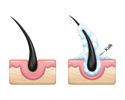 Studier viser at kalk danner en hård barriere rundt om hvert enkelt hårstrå. sætter sig fast hver eneste gang du går i bad.